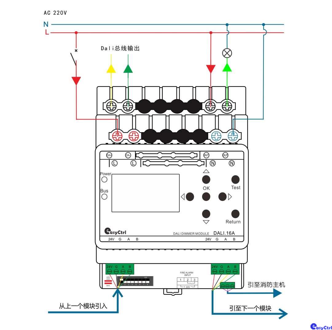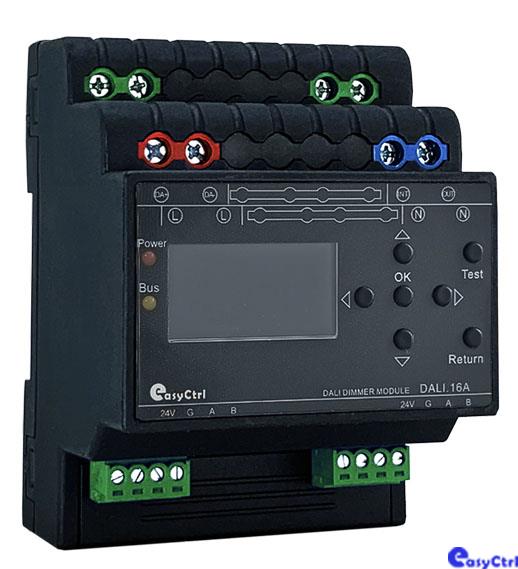 系统调光执行单元,一般安装在配电箱内,DALI2.0调光执行模块支持485总线协议与DALI协议的转换,支持DALI2.0协议,模块内置DALI电源,具有单条DALI总线,最多支持64个DALI驱动设备,可实现16个控制通道的调光调色,模块采用OLED显示屏,方便工程配置与调试。